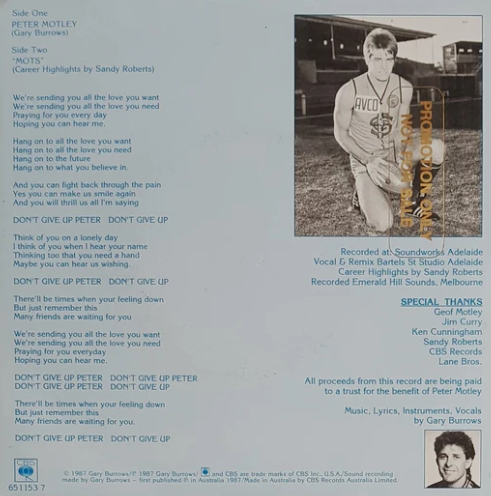 Song written by Gary Burrows in 1987, after Peter Motley’s tragic accident when a vehicle overturned and landed on his car’s roof. Gary wrote this while watching him being airlifted to Adelaide Airport, for transfer to the Royal Adelaide Hospital. A deal was made with CBS Records that enabled the proceeds of all record sales and royalties to go direct to Peter’s rehabilitation.